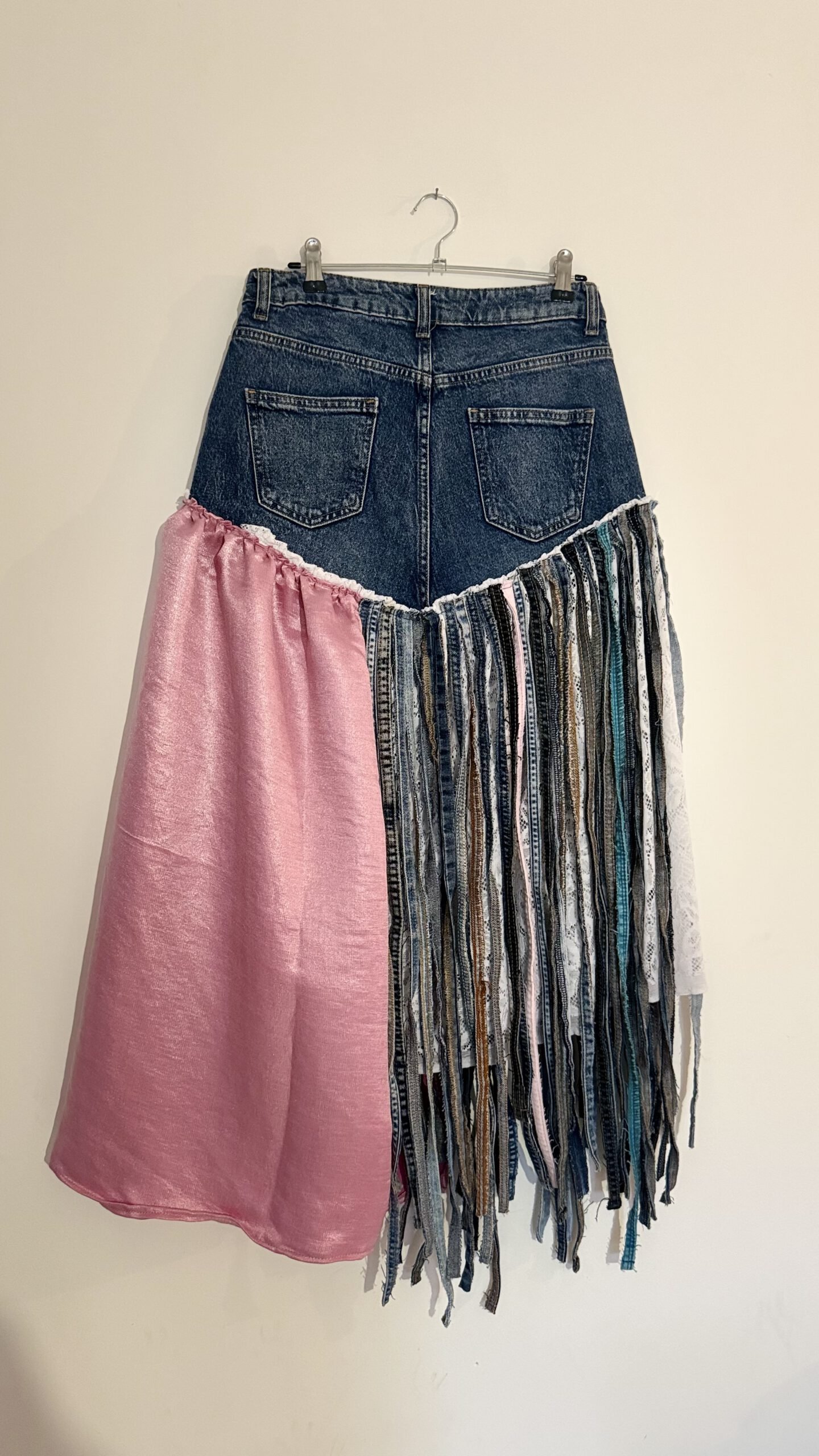 Jupe upcyclée bohème en jean et textile ajouré satiné – Pièce unique