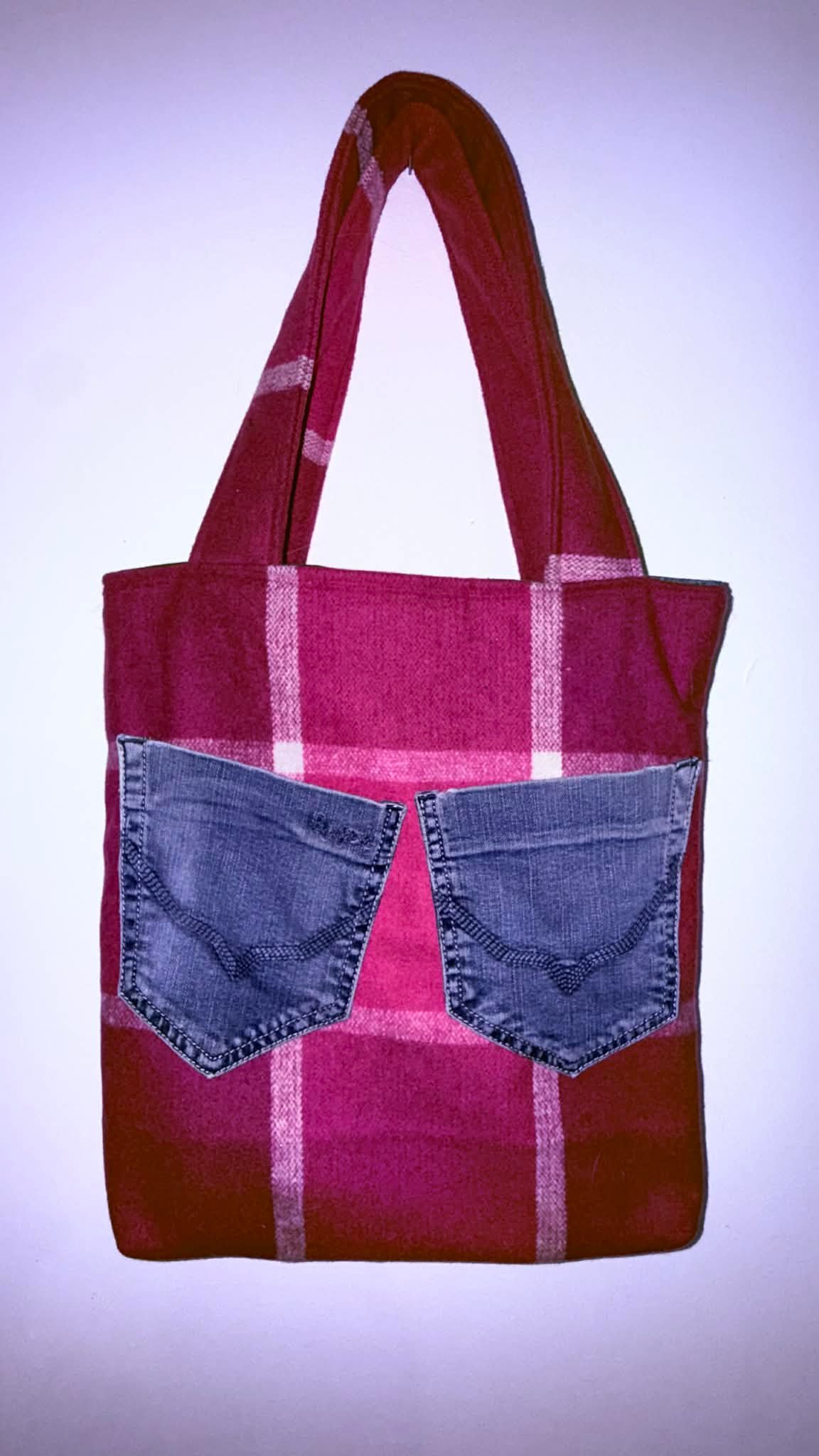 Ce tote bag a été réalisé à partir de jeans recyclés et d’un textile écossais épais récupéré, à l’aspect laine. L’association des matières crée un contraste fort entre robustesse du denim et douceur visuelle du tissu rouge.