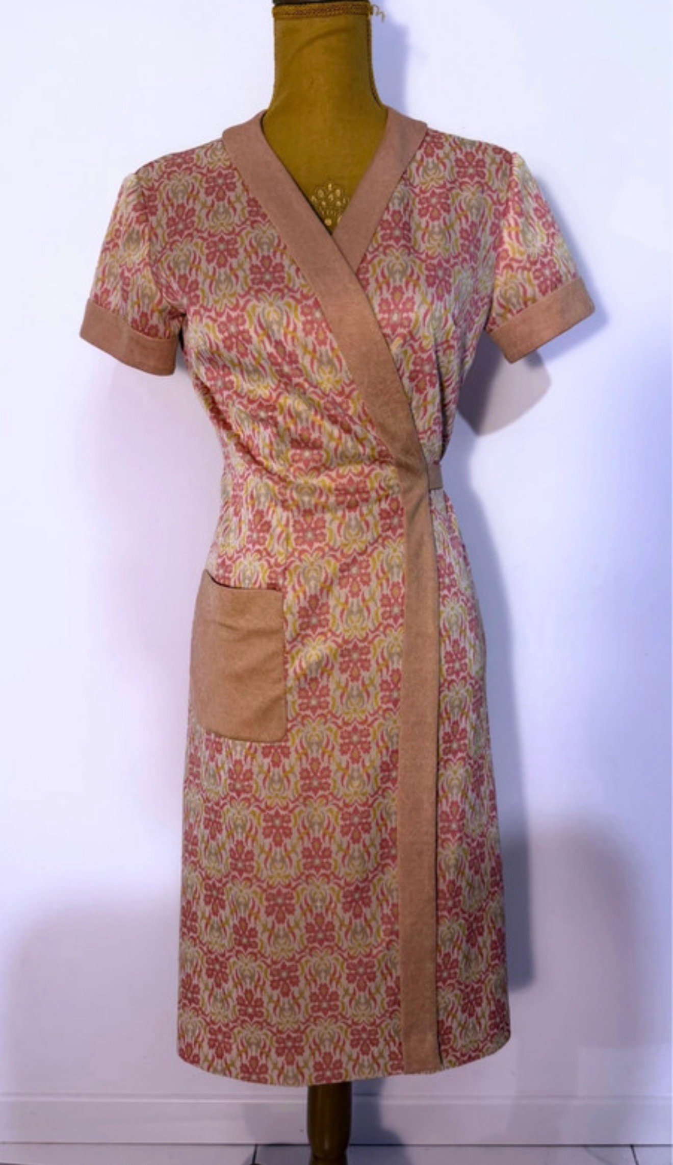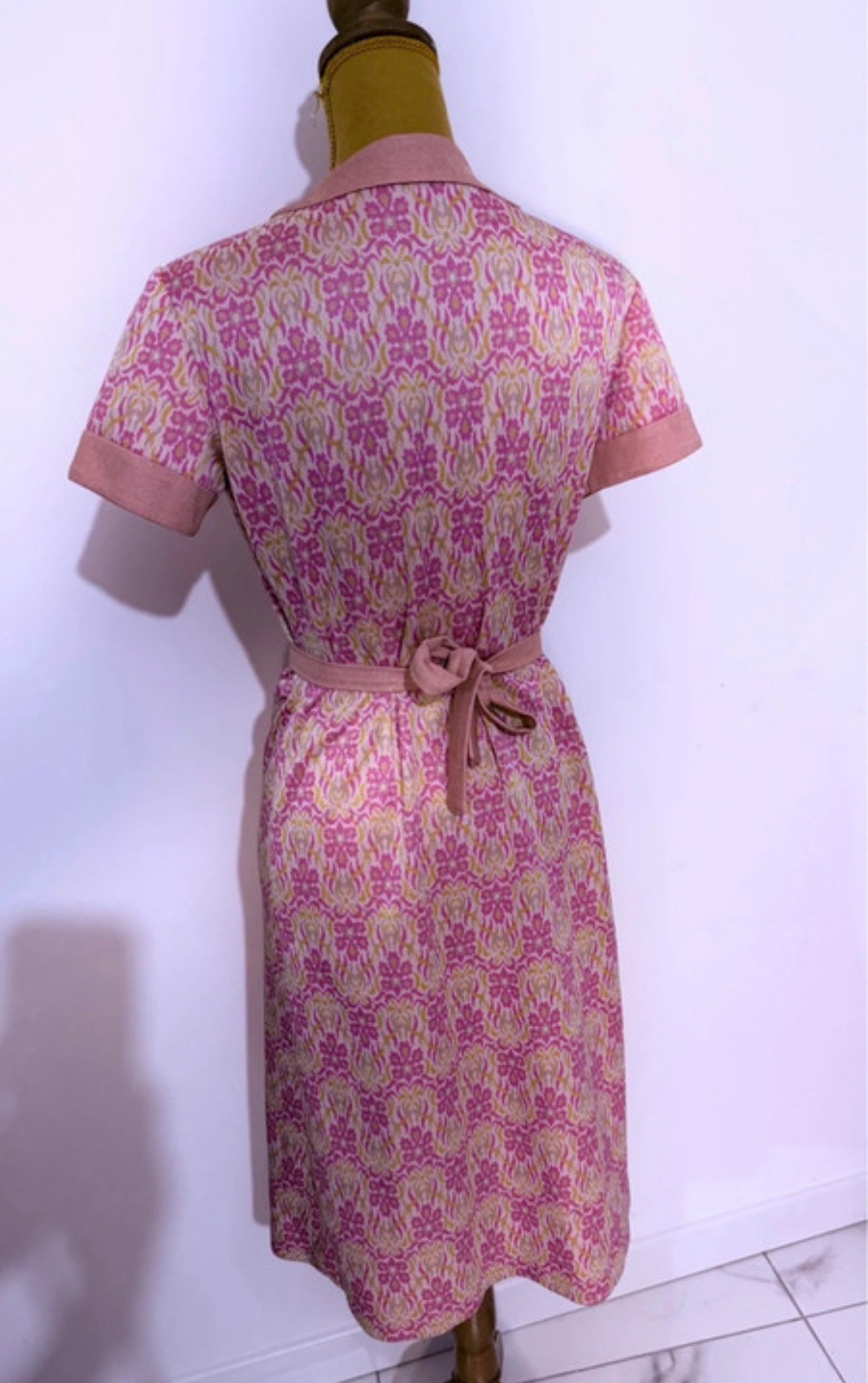 Robe vintage taille 36 au charme délicieusement rétro, avec une coupe portefeuille féminine et flatteuse. Sa silhouette épouse la taille grâce à une ceinture à nouer dans le dos, dessinant une ligne élégante et naturelle.