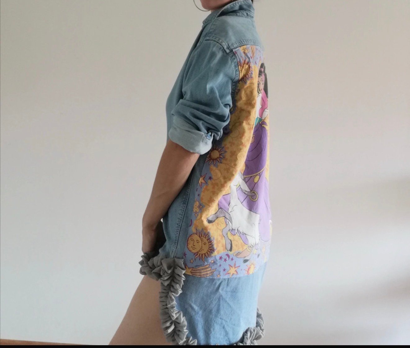 Le bas du vêtement est sublimé par des froufrous en tulle, qui viennent casser la rigidité du denim et créer du mouvement. Ce contraste entre matière brute et transparence légère donne à la pièce toute sa singularité.