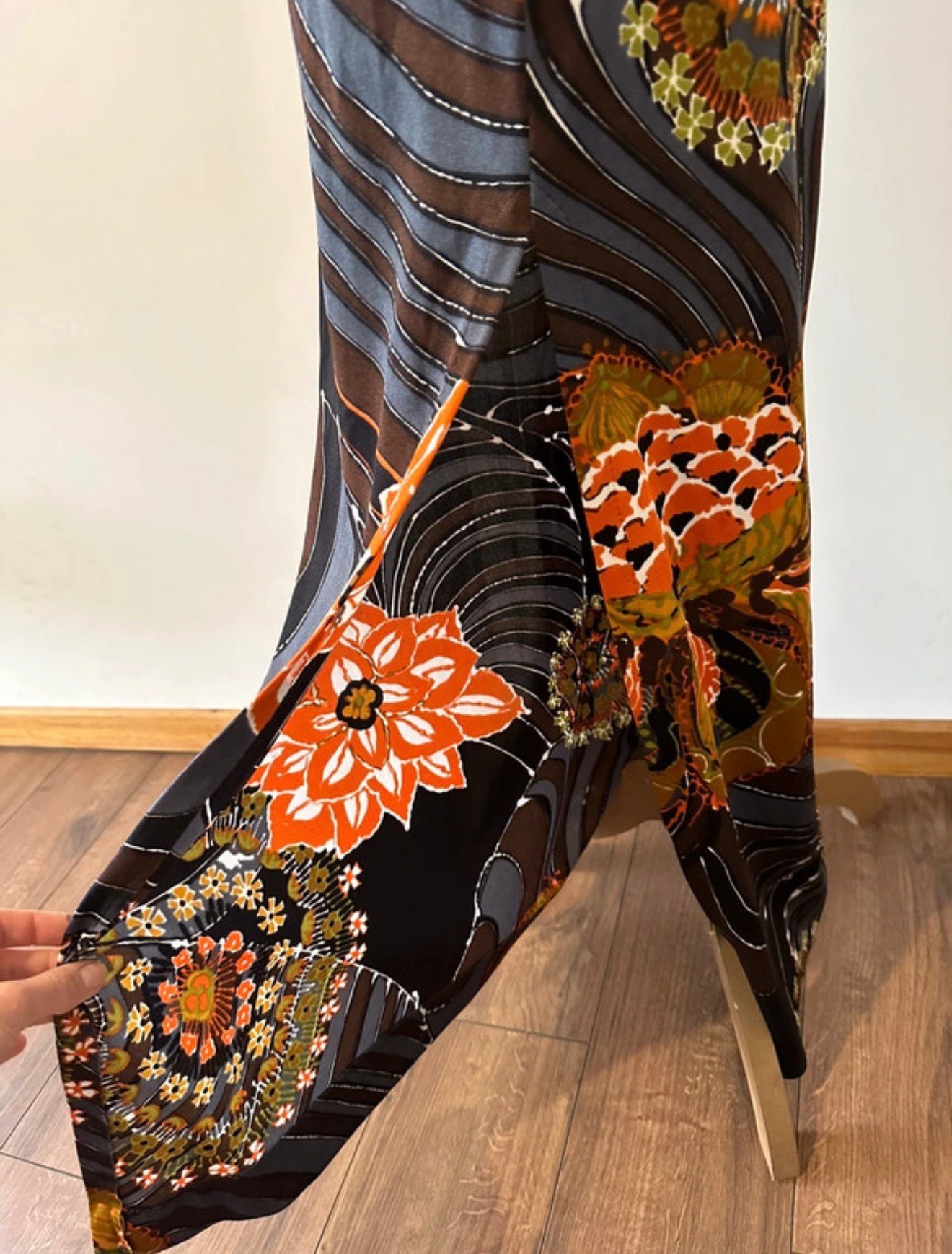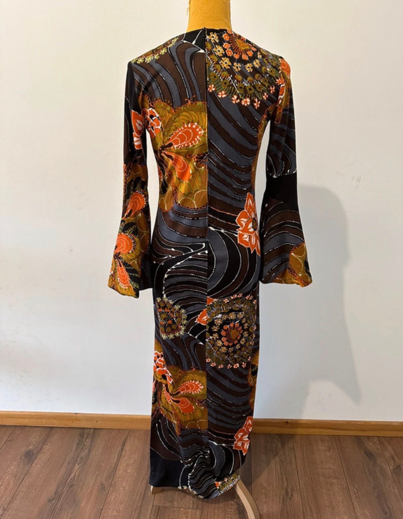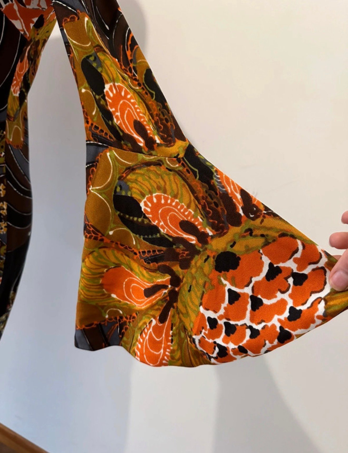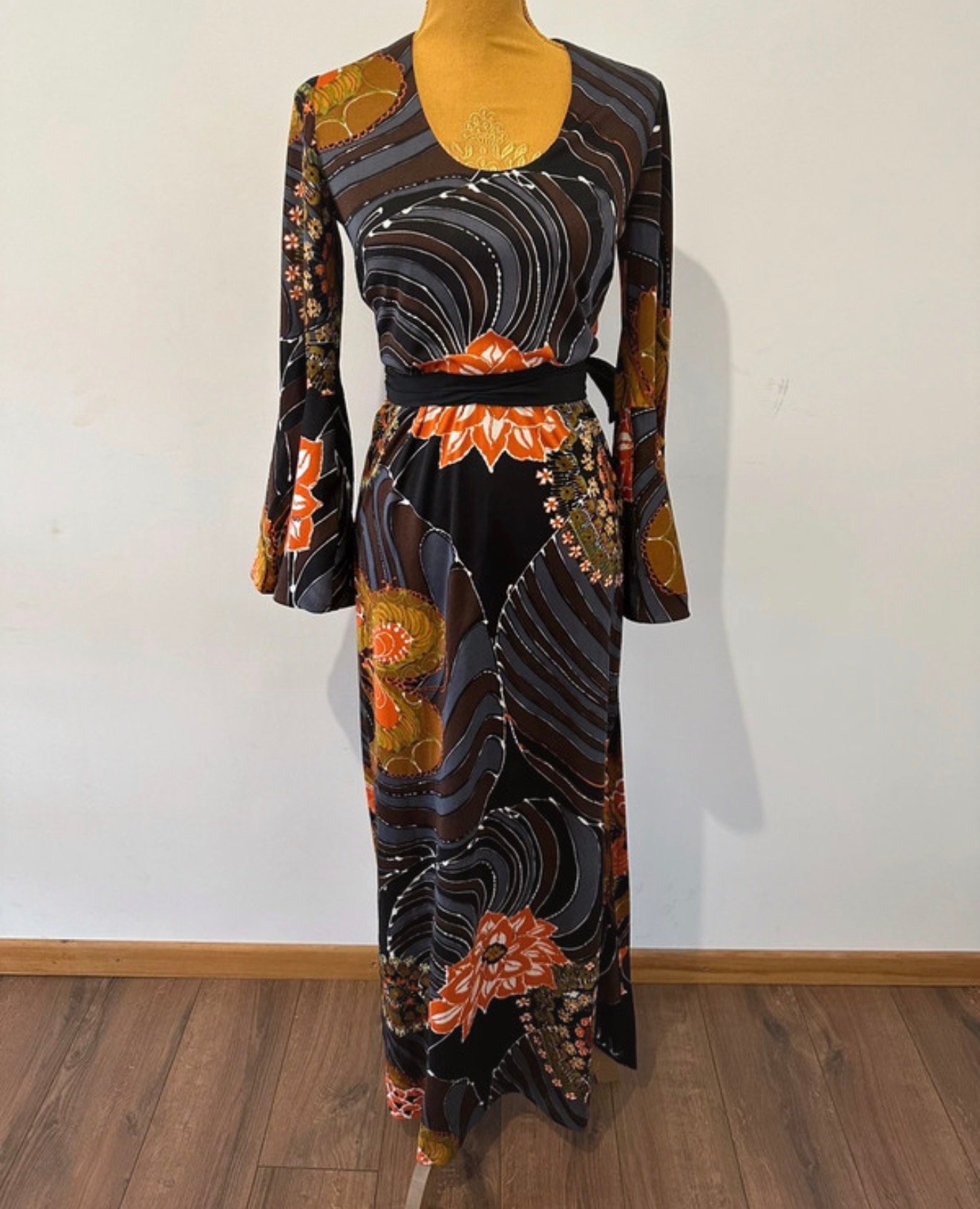 Robe vintage longue au caractère puissant, très probablement issue de l’esthétique années 70, reconnaissable à ses motifs graphiques ondulants, ses grandes fleurs stylisées et ses manches évasées spectaculaires.