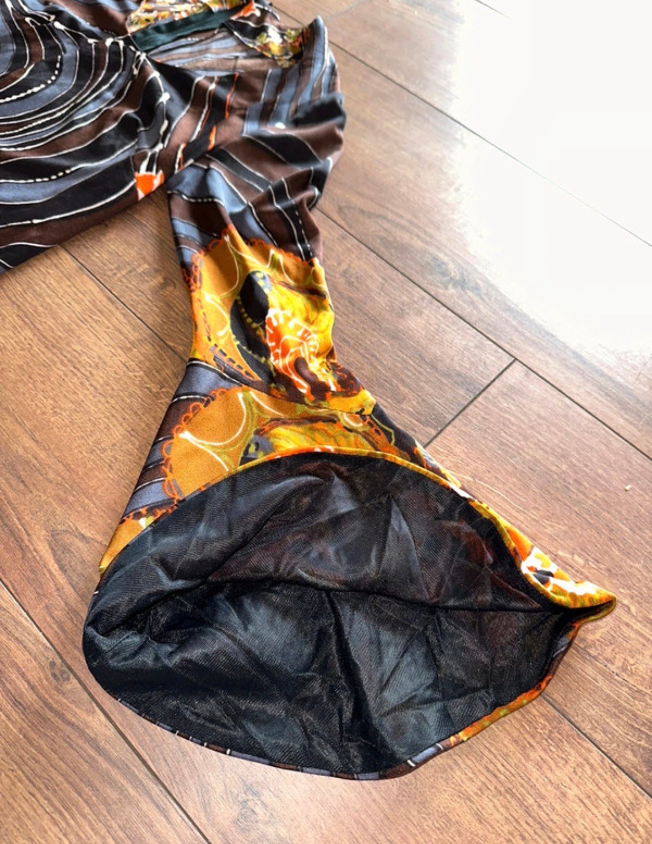 Le tissu, fluide et extensible, présente un imprimé psychédélique dans des tons profonds de noir, chocolat, gris, ocre et orange brûlé, avec des fleurs oversize et des motifs spiralés qui sculptent visuellement la silhouette.