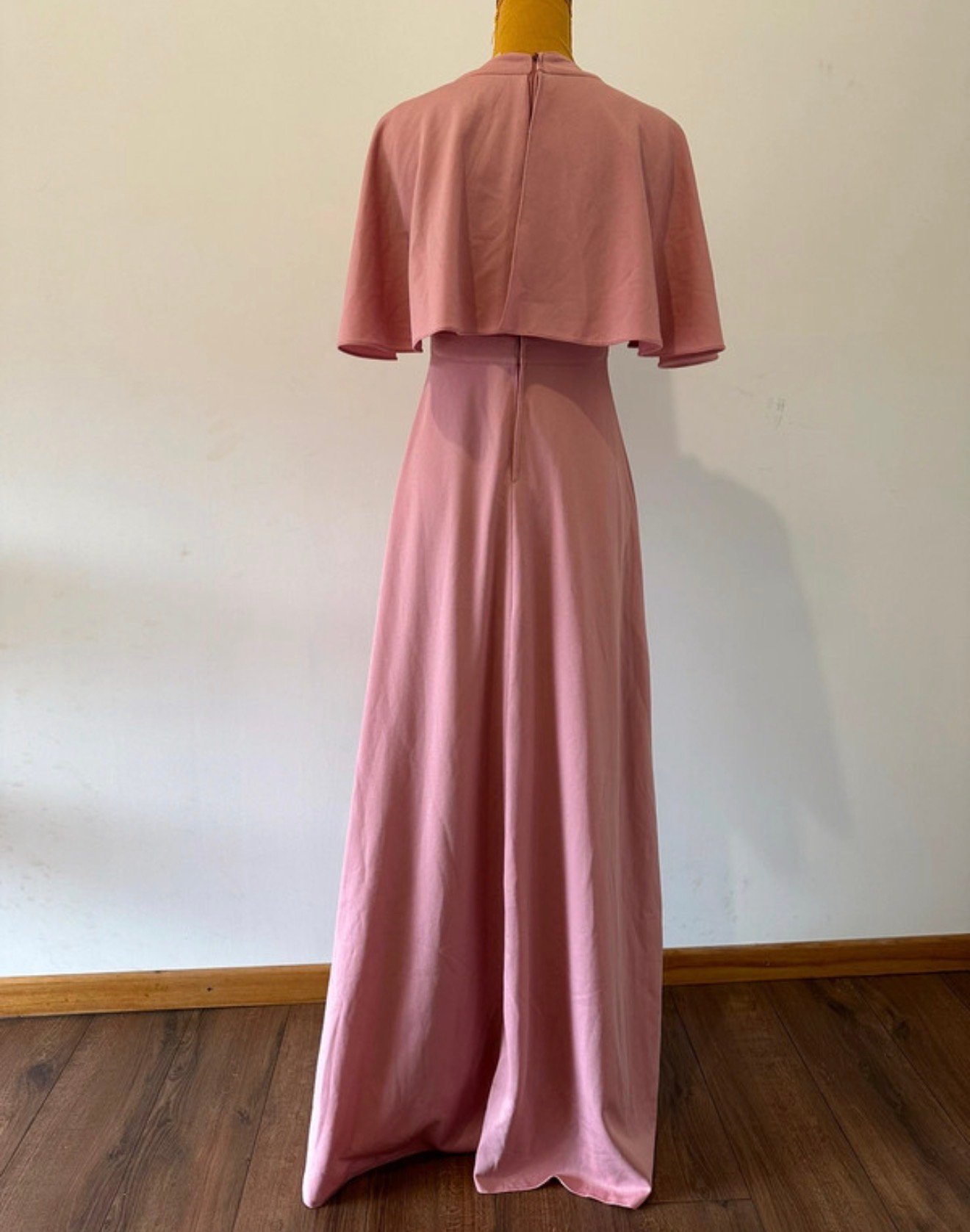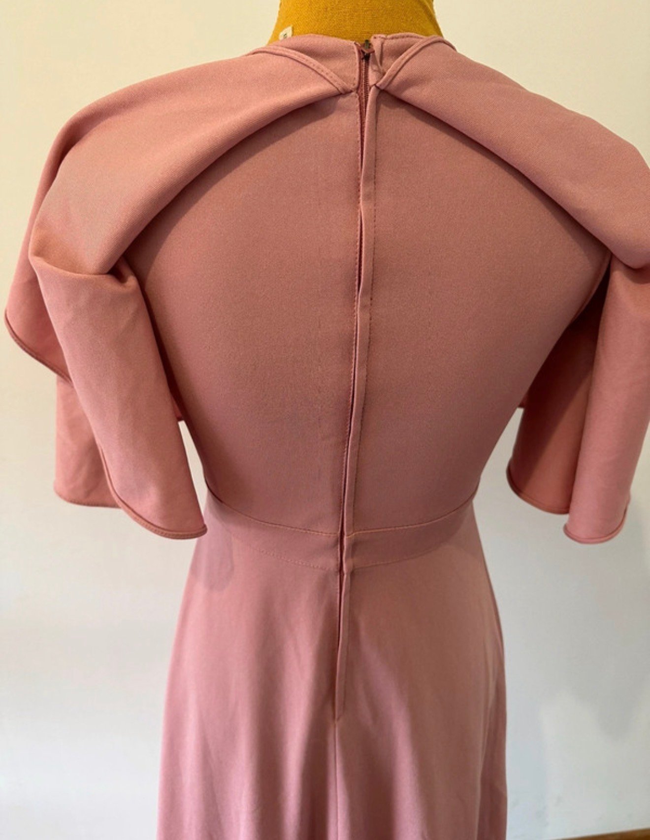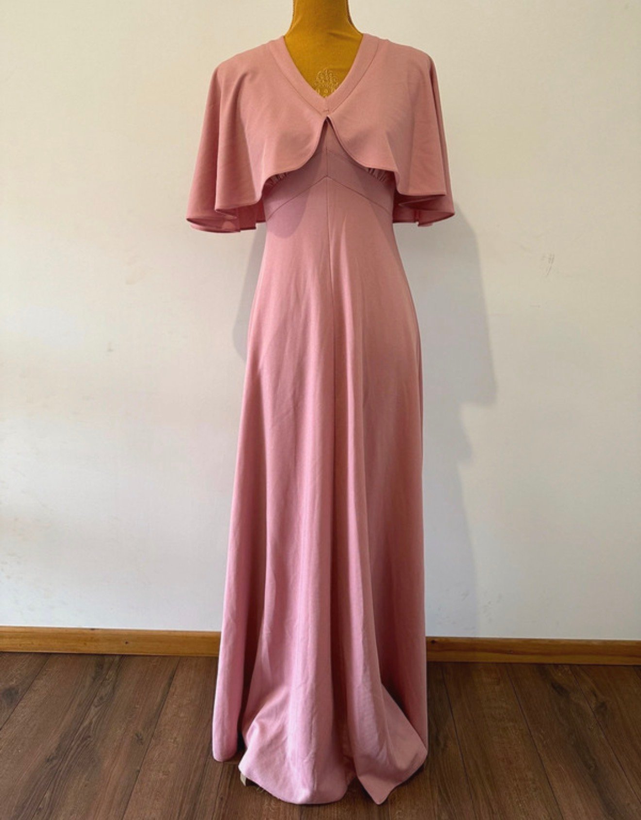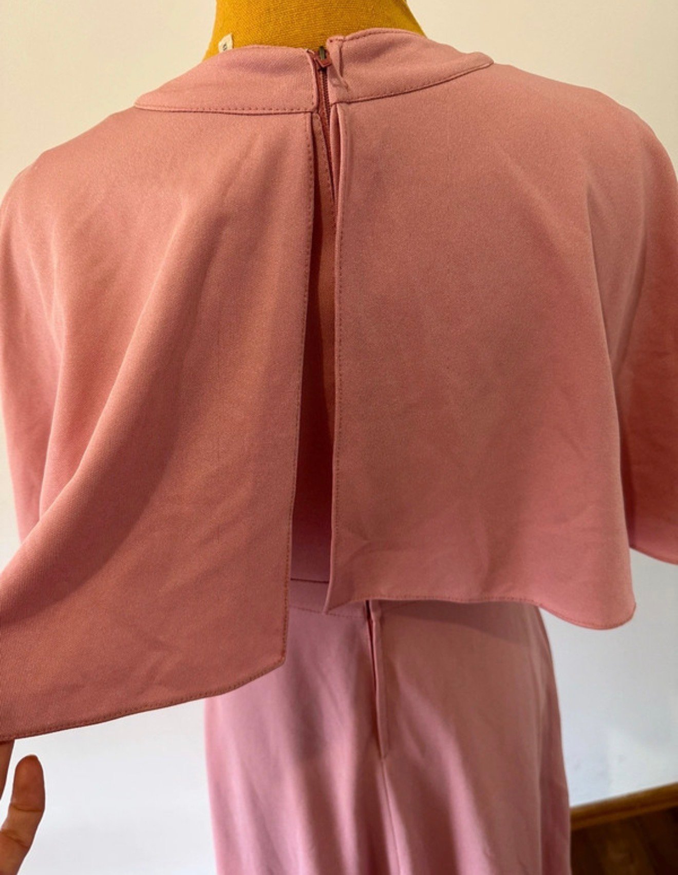 Confectionnée dans un tissu fluide au tombé souple, dans un rose poudré délicat, cette robe joue sur la superposition : une base longue et élancée, surmontée d’une cape courte cousue au niveau des épaules, créant un mouvement aérien et une silhouette presque céleste.