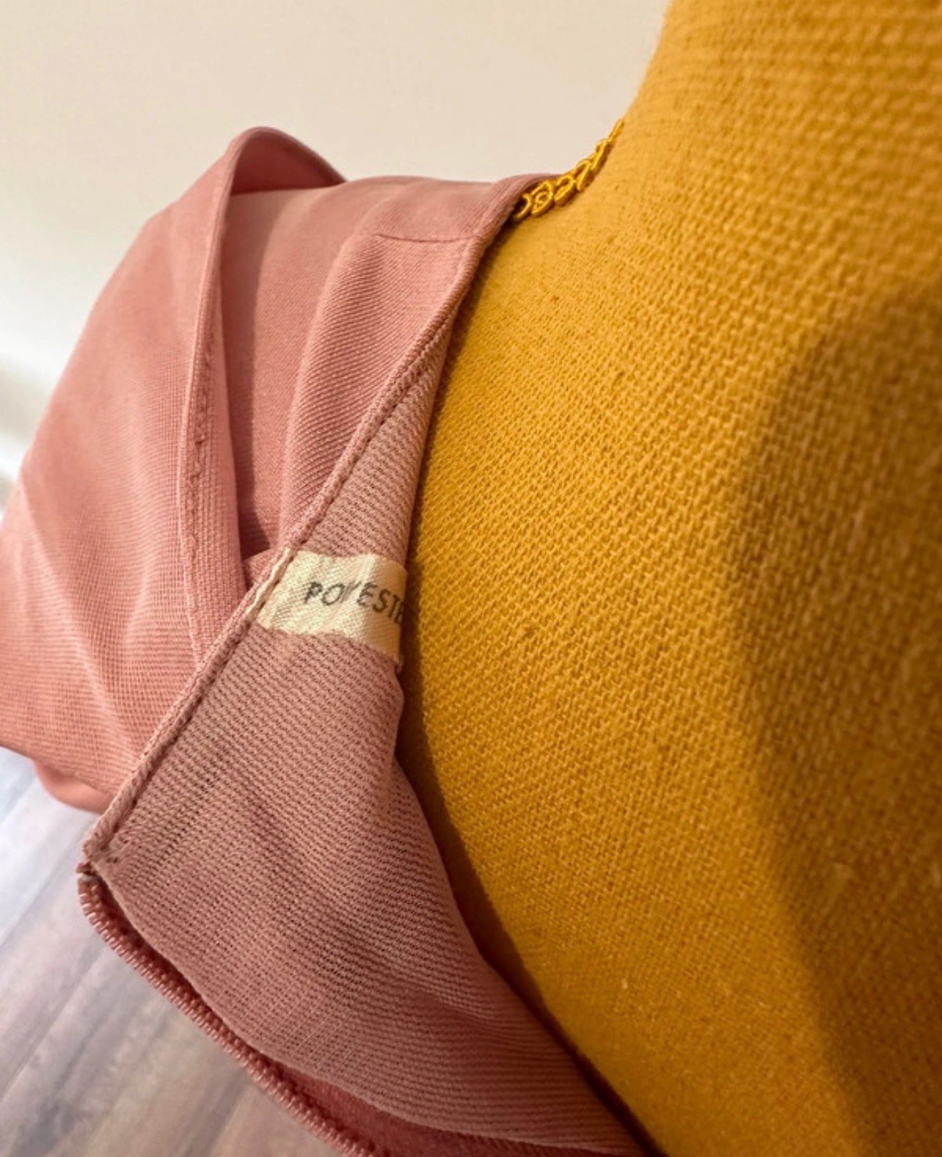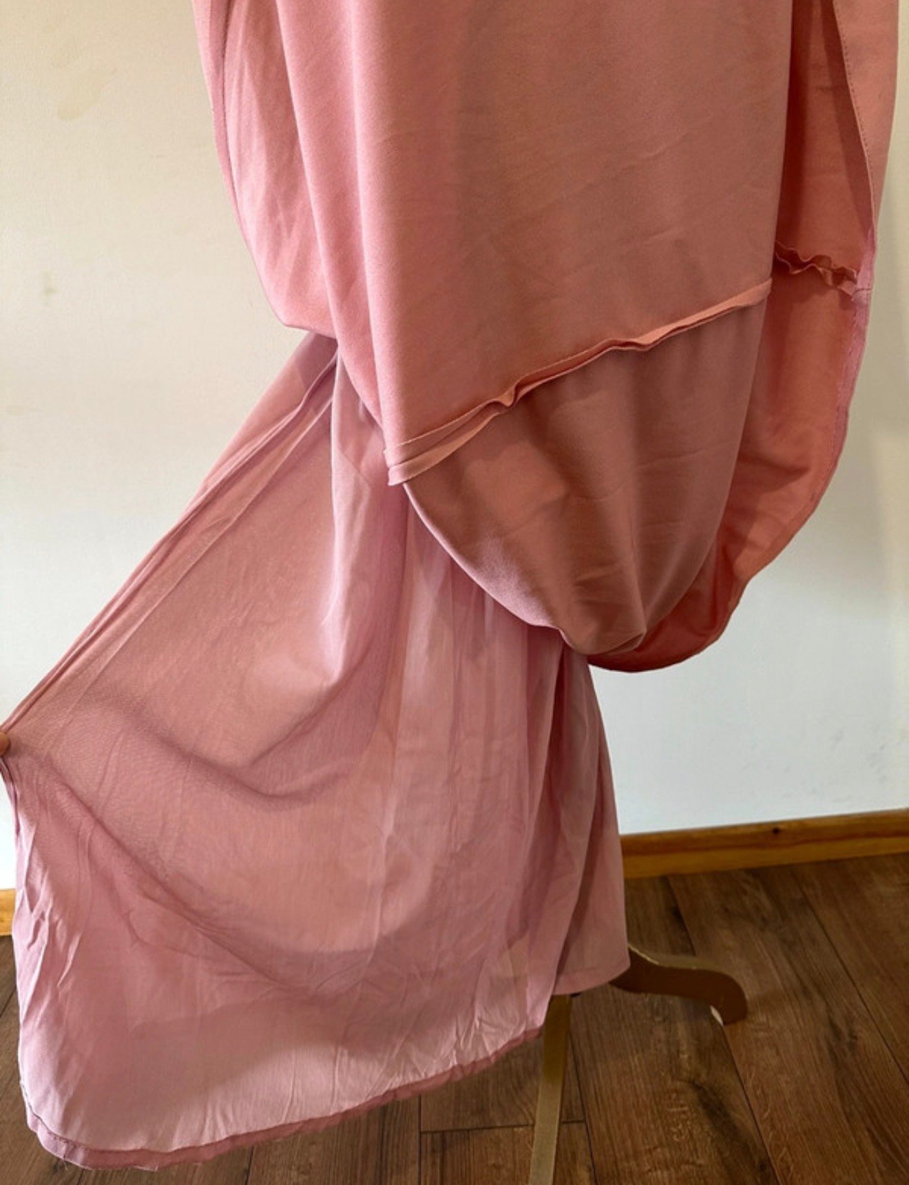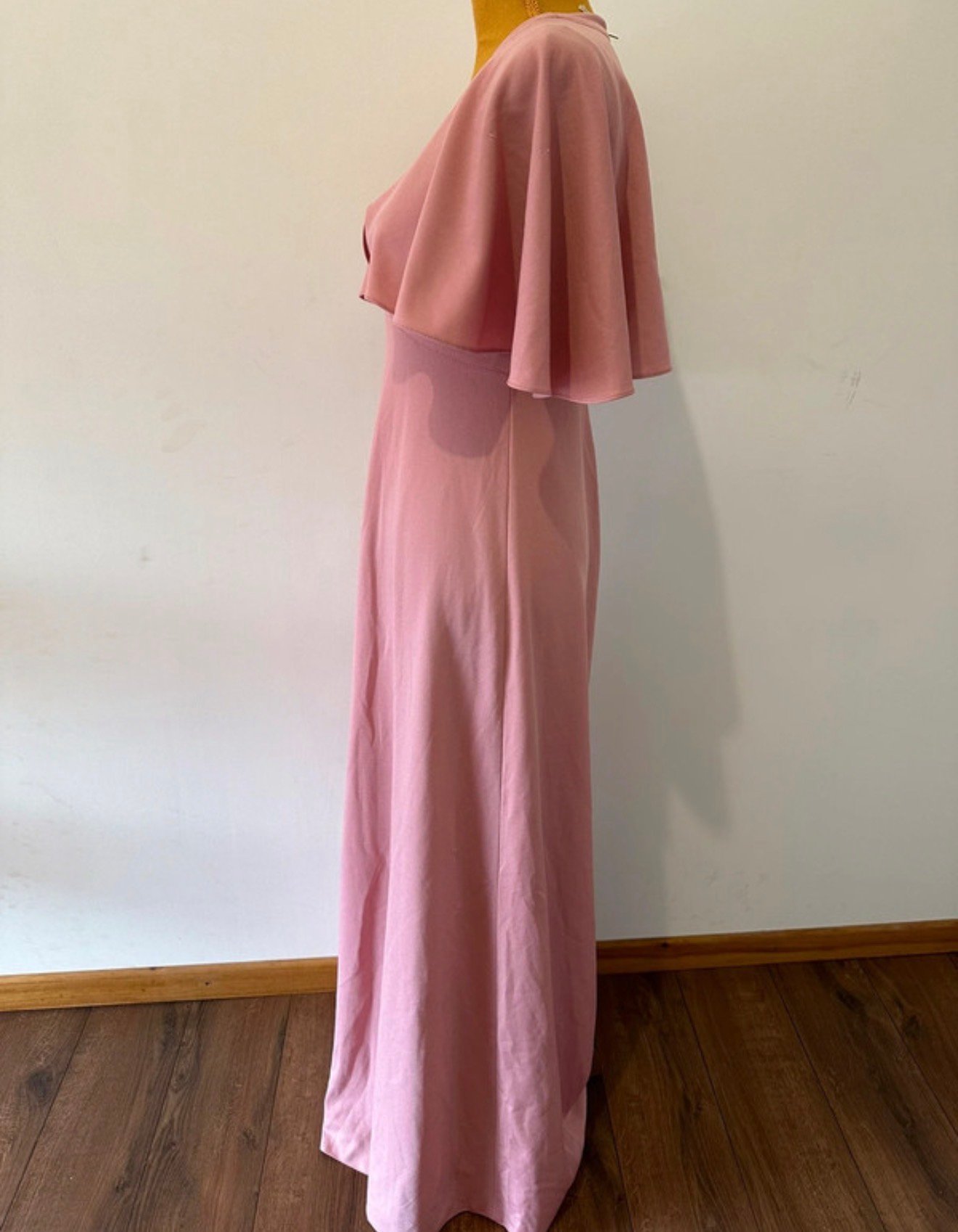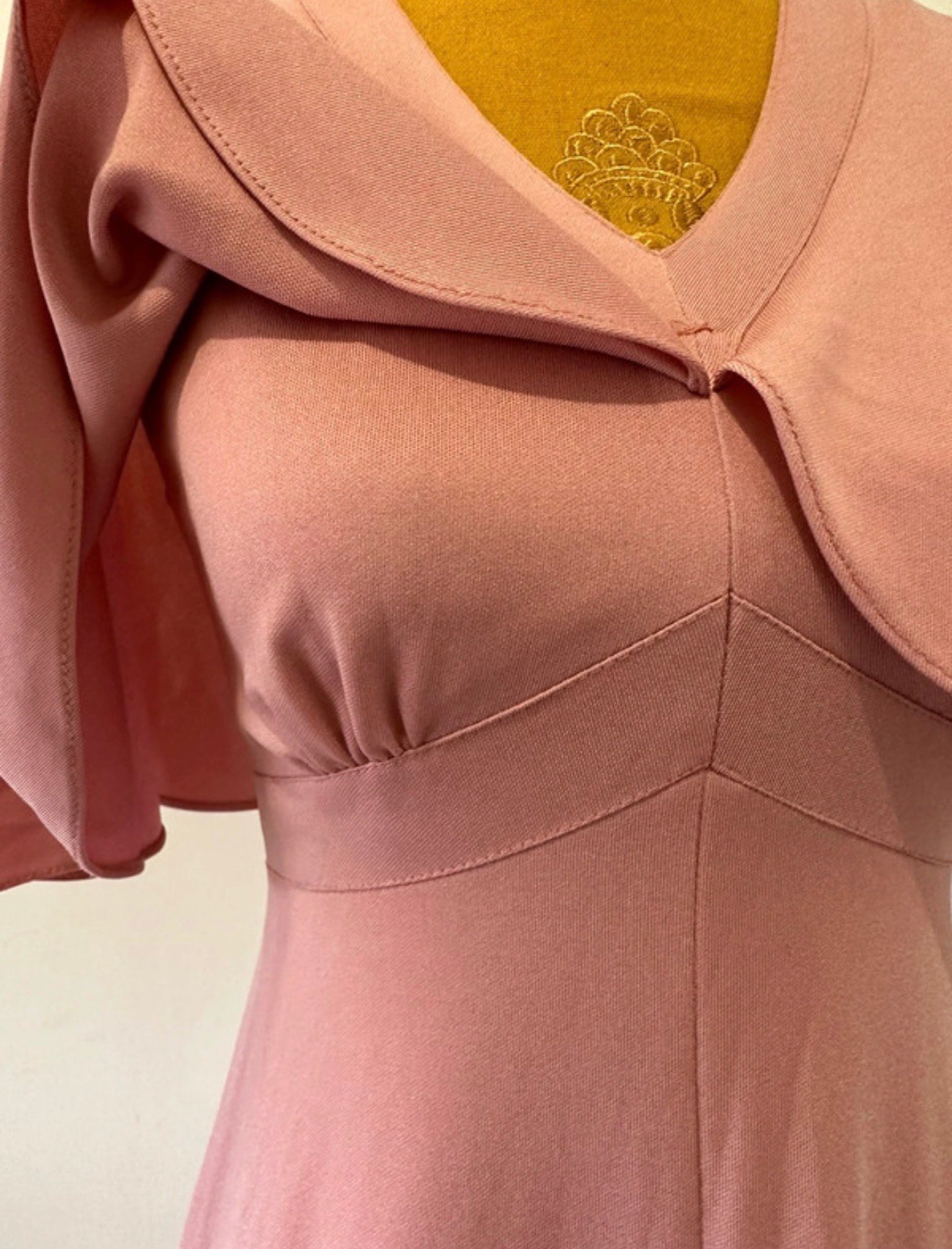 Confectionnée dans un tissu fluide au tombé souple, dans un rose poudré délicat, cette robe joue sur la superposition : une base longue et élancée, surmontée d’une cape courte cousue au niveau des épaules, créant un mouvement aérien et une silhouette presque céleste.