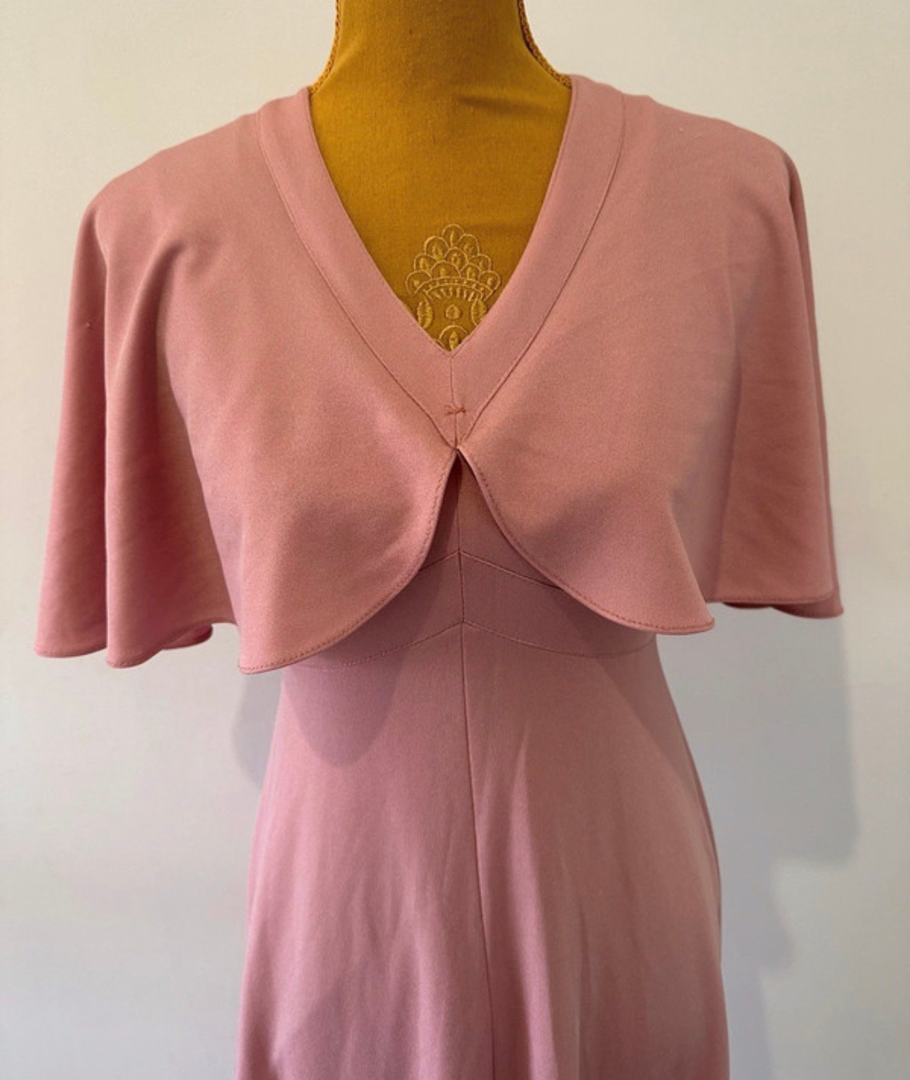 Robe vintage longue d’une élégance délicate, très probablement issue de l’esthétique années 70, reconnaissable à sa coupe fluide, sa taille empire marquée et son sublime voile cape intégré qui recouvre les épaules et les bras comme un nuage de tissu.