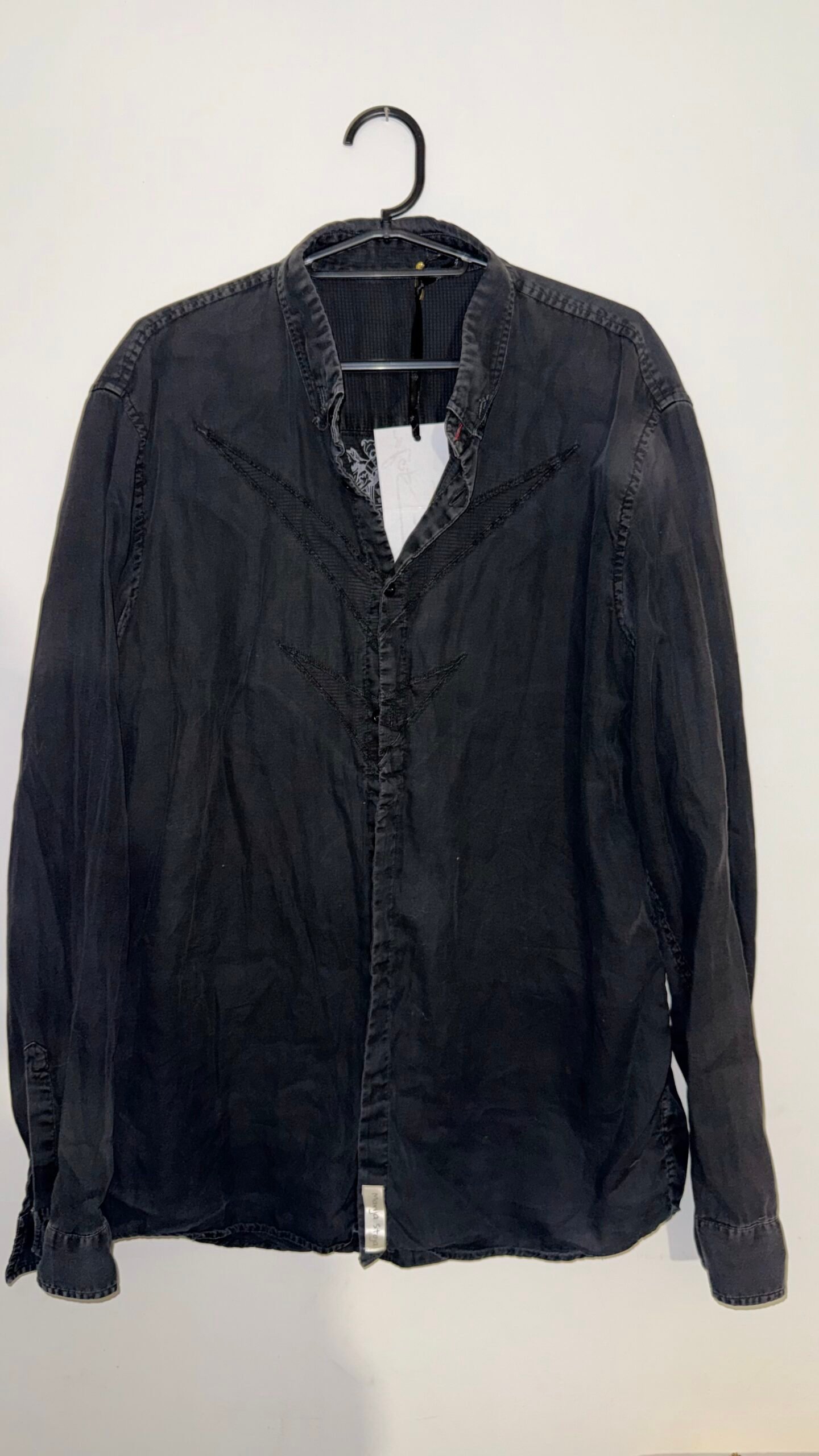 Cette chemise customisée est réalisée à partir d’une chemise noire vintage. Sa base minimaliste met en valeur la transformation artistique réalisée au dos.