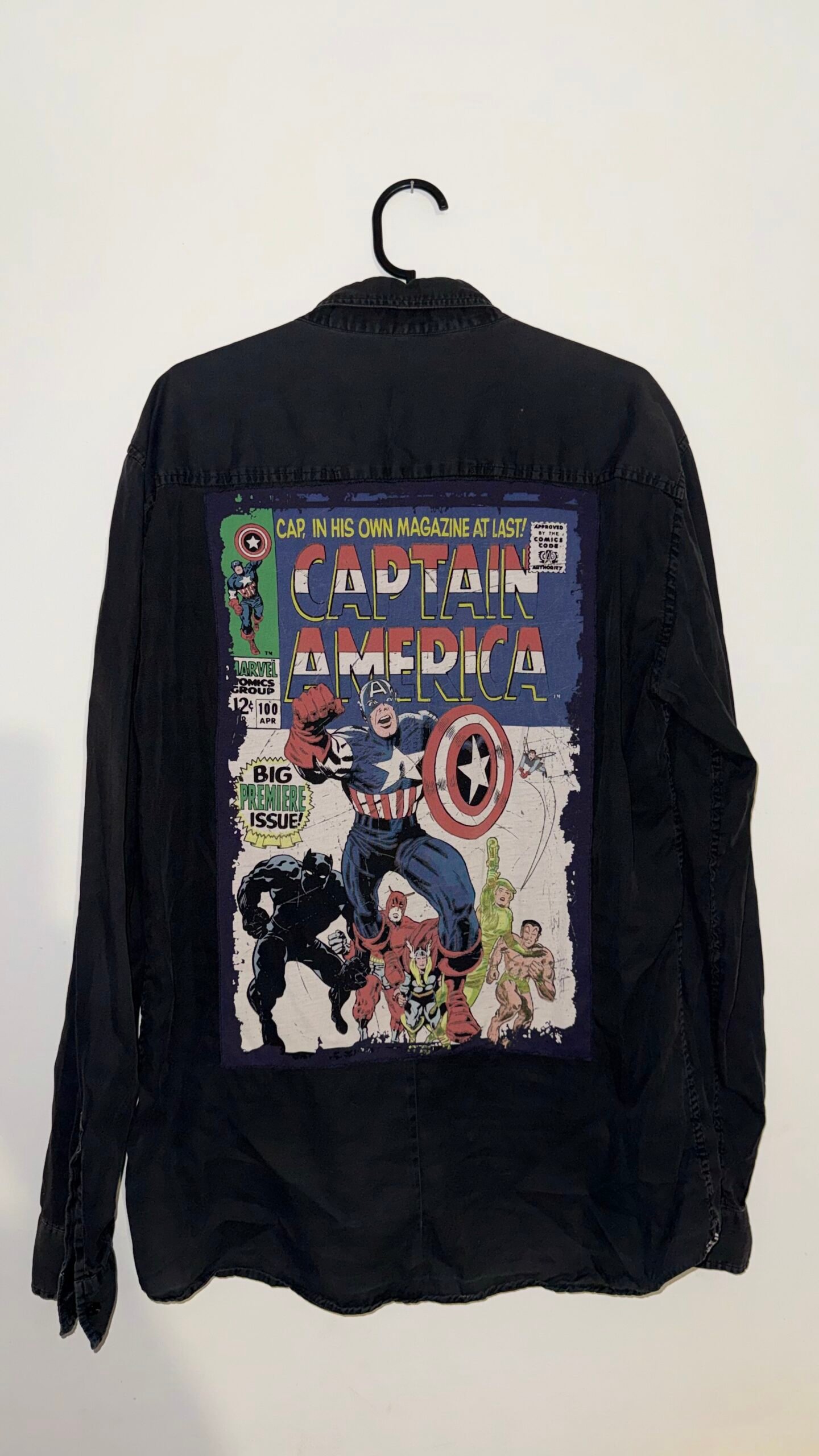 Cette chemise customisée Captain America mélange univers streetwear et culture comics. Le contraste entre le noir profond de la chemise et l’illustration colorée donne à la pièce un style fort et original.