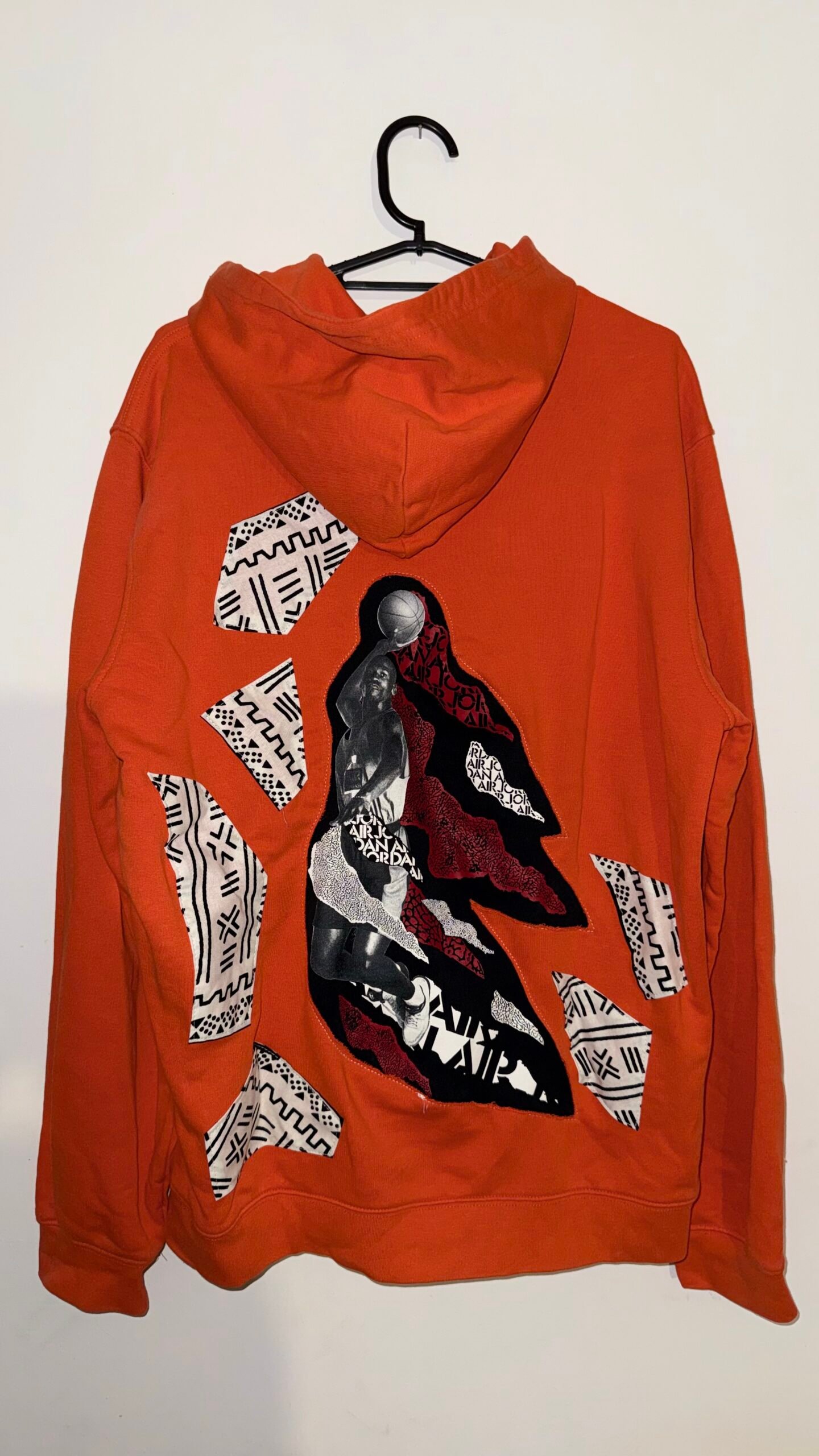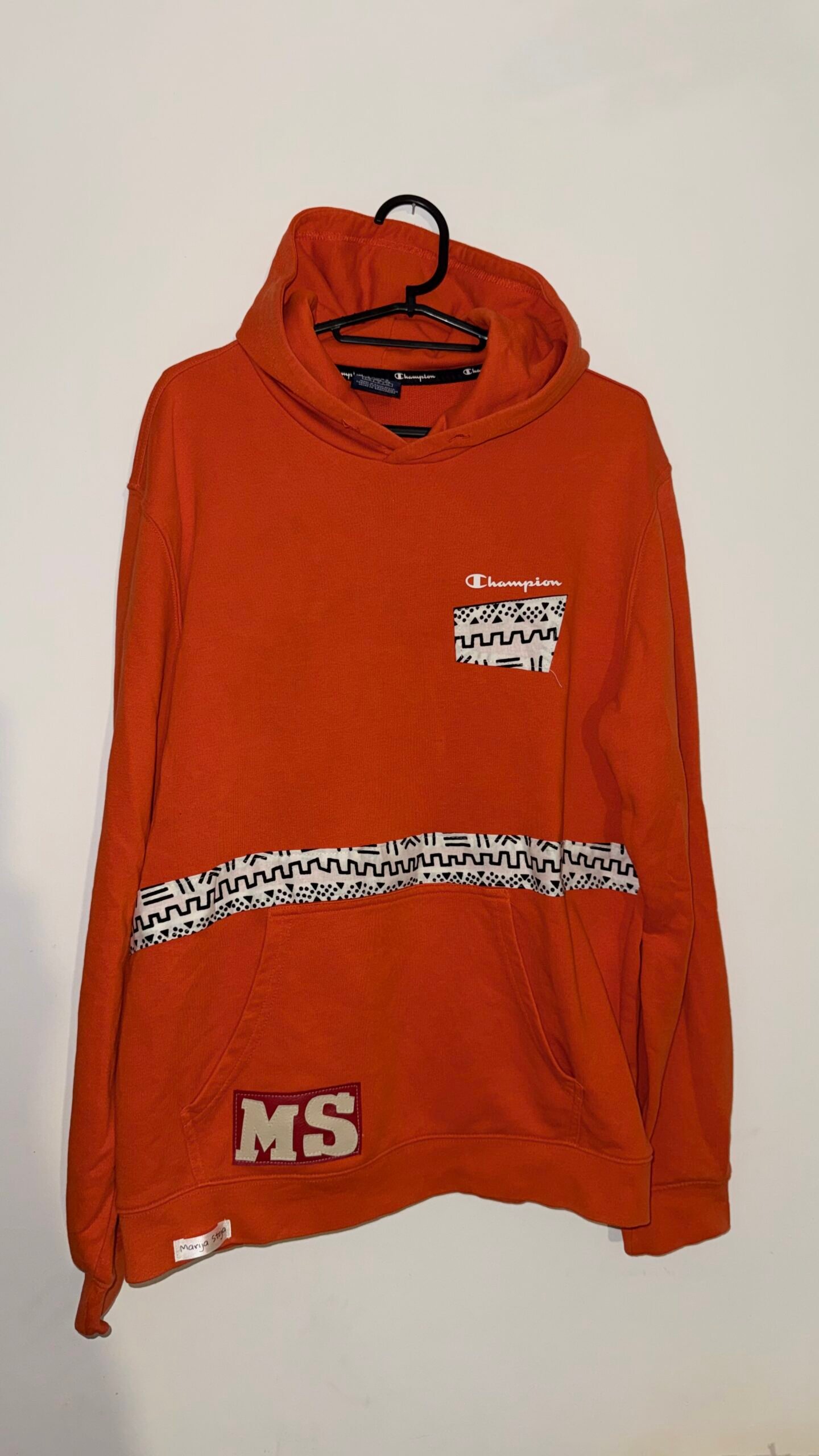 Ce sweat à capuche Champion a été transformé en pièce unique grâce à une intervention artistique inspirée du streetwear et du collage graphique.