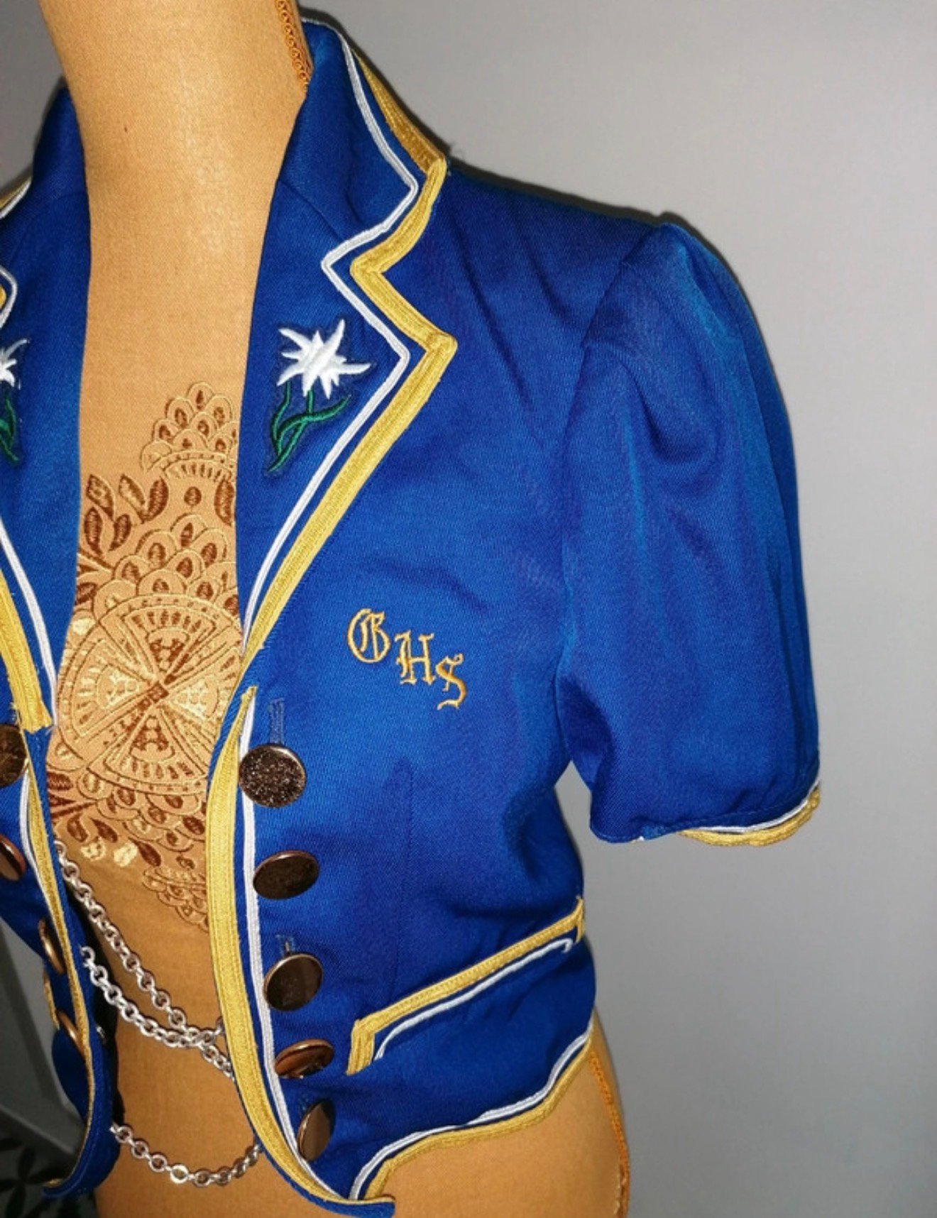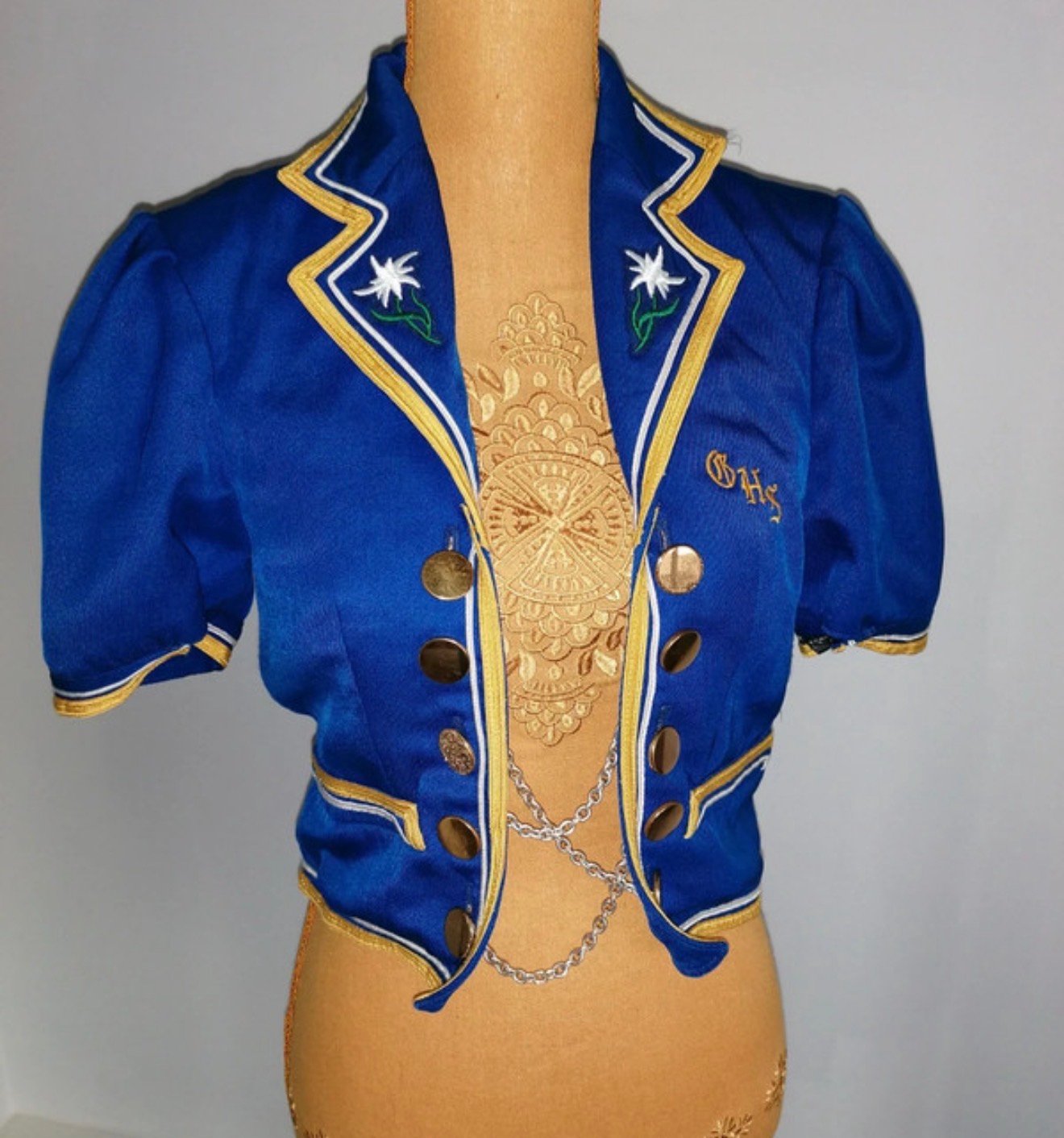 Décor : broderies edelweiss, boutons dorés, chaînes métalliques