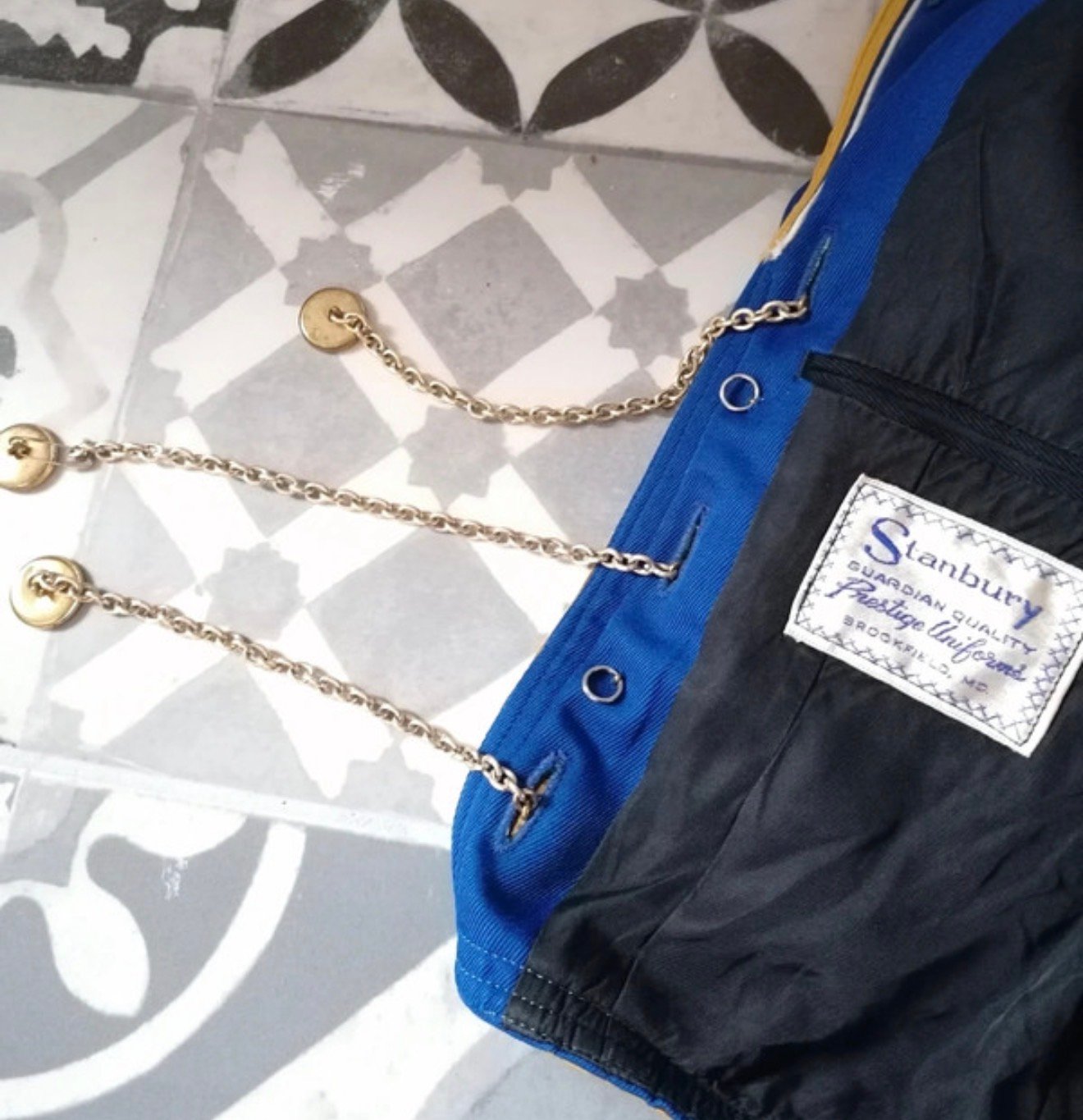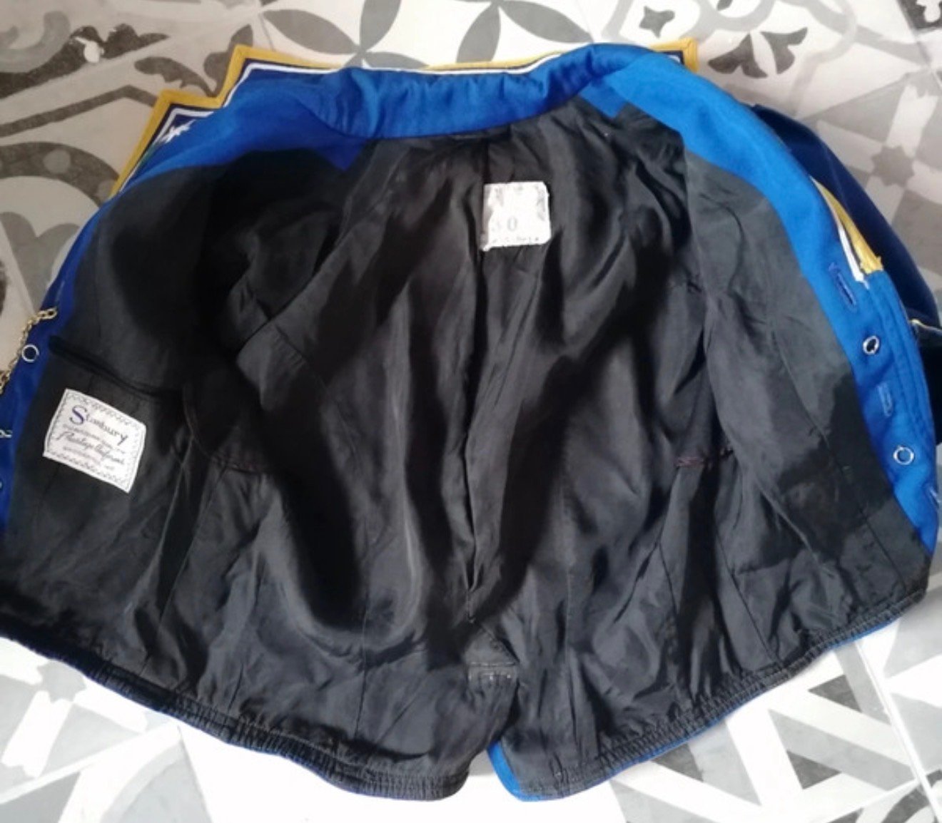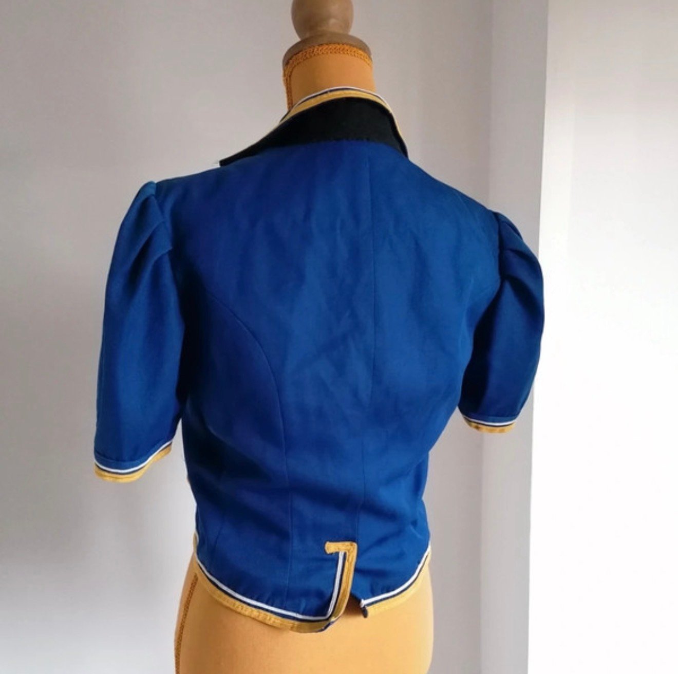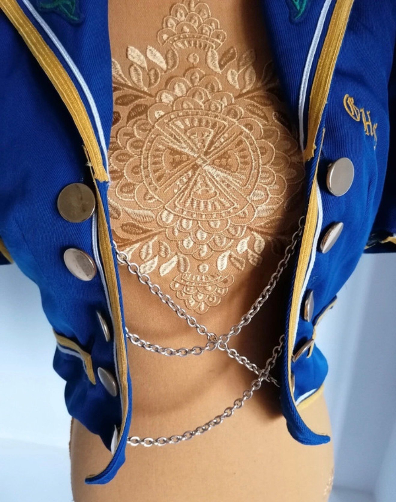 Courte et cintrée, elle sublime la silhouette avec une coupe très structurée et un tombé qu’on ne voit plus aujourd’hui. Le bleu profond est rehaussé de galons dorés, de broderies florales blanches sur le col, et surtout de chaînes métalliques décoratives fixées sur de véritables boutons, qui donnent à la pièce un aspect à la fois noble, théâtral et couture.